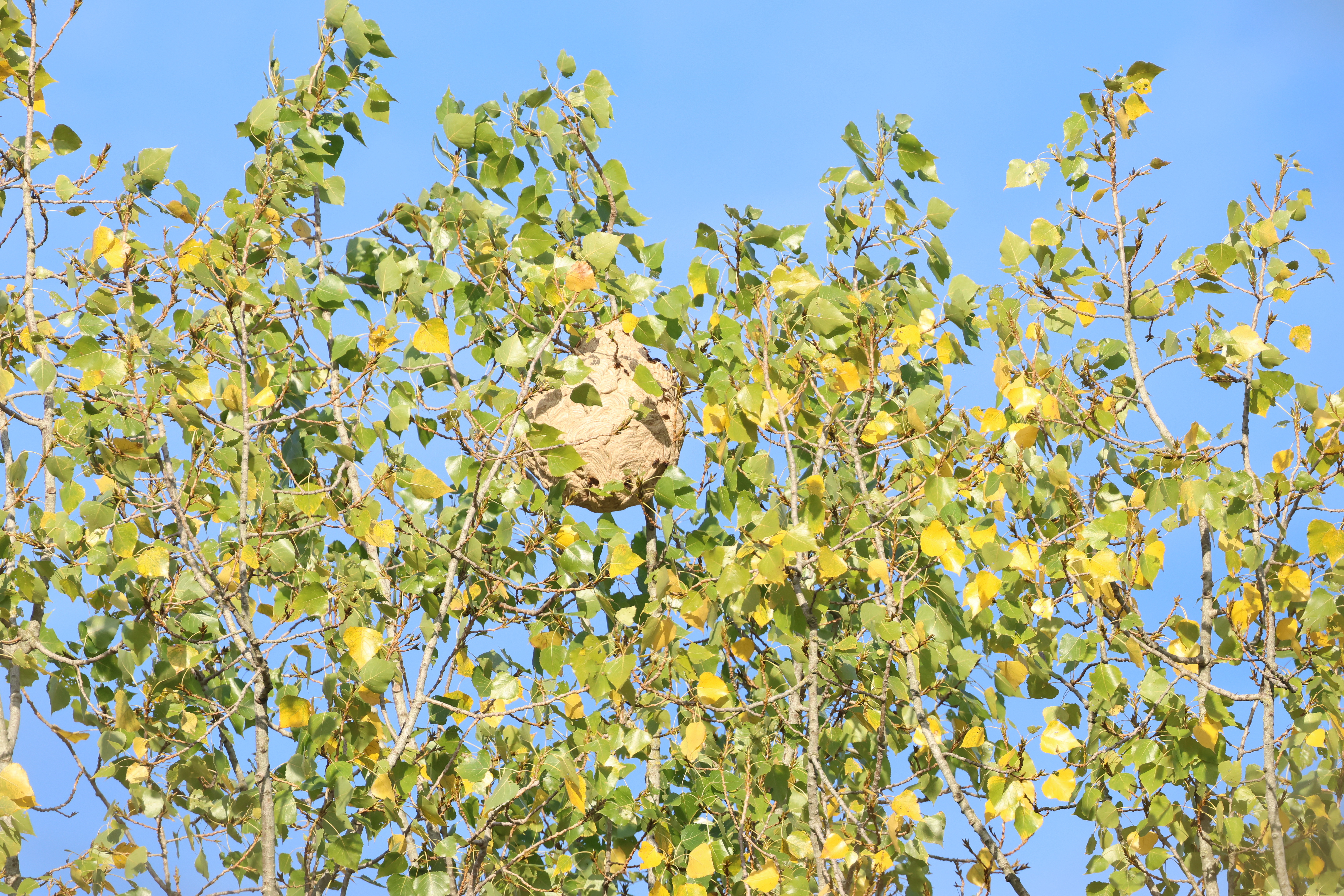 Toen ik zondag even in de tuin zat, plofte er opeens een jonge Wespendief in de Populier van het hoornaar nest. Wow! Een Wespendief zie je vaak overvliegen, maar een jonge vogel zo dichtbij in een boom. Dat is toch wel heel gaaf. De roofvogel leek weinig interesse te tonen in het nest. Na wat research lijken Wespendieven vooralsnog alleen Europese hoornaars te eten en laten ze de Aziaat links liggen. Lees onder andere dit artikeltje: https://natuurtijdschriften.nl/pub/595281/DTKL2014022002002.pdf. Hoewel er in Frankrijk en Spanje al wel meldingen zijn van honingraat resten van Aziatische hoornaars in Wespendief nesten. Wellicht is de oplossing van het invasieve exoten probleem dus dichterbij dat we denken? En moet de Wespendief alleen nog zijn eerste ‘koffie’ drinken.